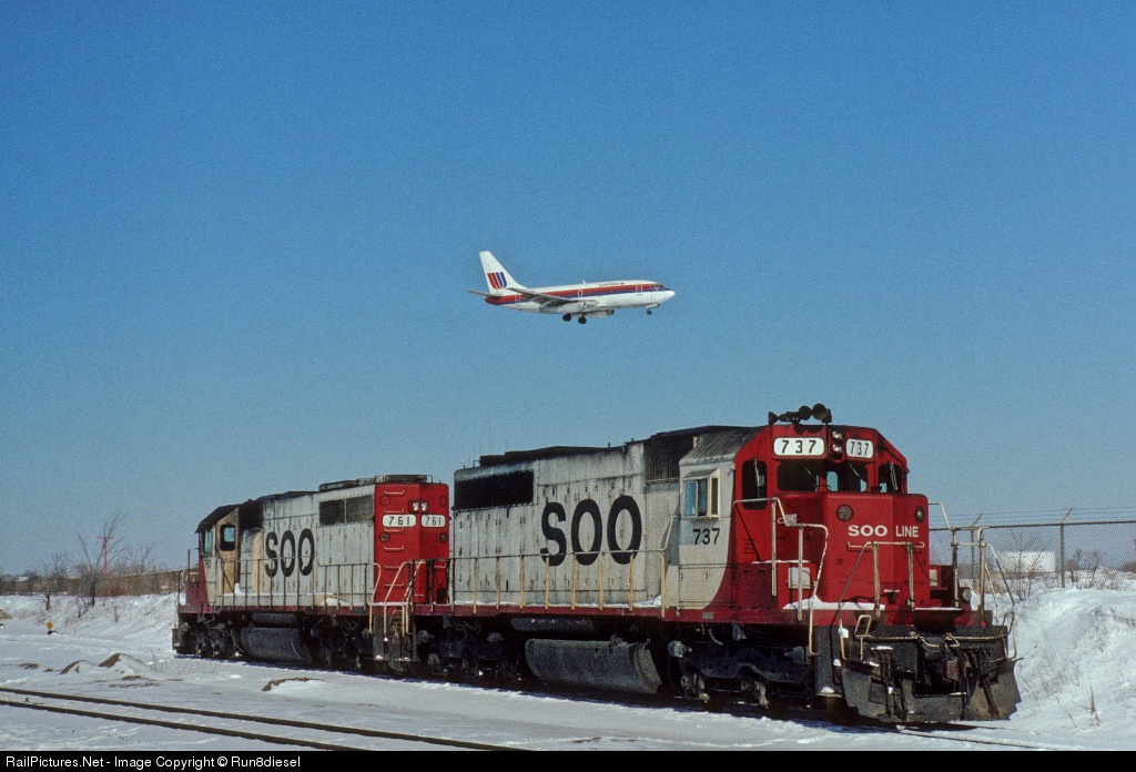 | SOO 737 meets a United 737...a pair of SOO Line SD40s rest at Bryn Mawr yard while a United Boeing 737 passes overhead, on final approach to Ohare airport. Scanned from a Kodachrome 64 slide. |