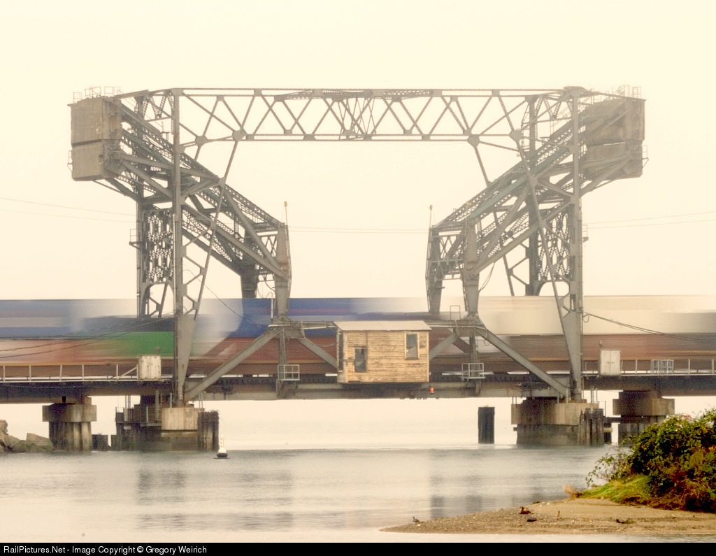 It's a two train meet on bridge 14. A UP stack train's cars blur enough to reveal the trailing unit on A BNSF empty garbage train.