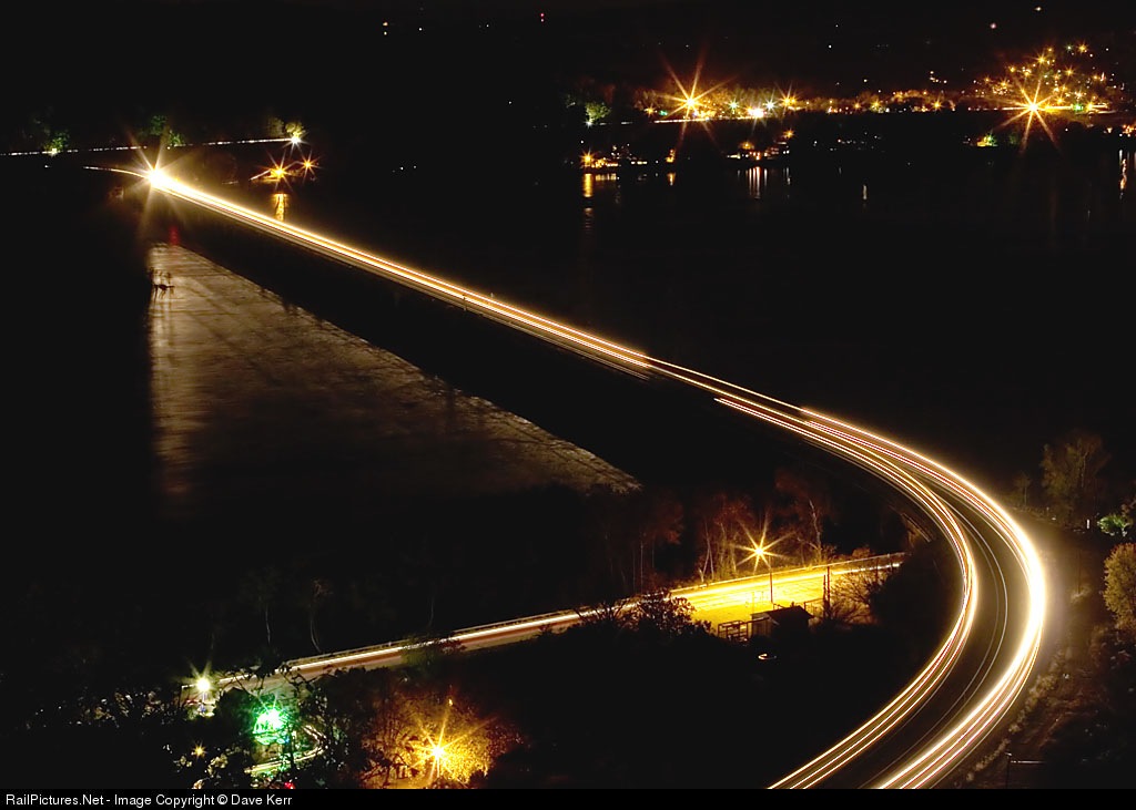 The lights of Marysville glow in the background, as NS 3563 leads a light engine move from Enola to Harrisburg and shares the bridge with an eastbound intermodal at 18:19. Canon 20D and 24-70mm lens, 246 second exposure @ f18.