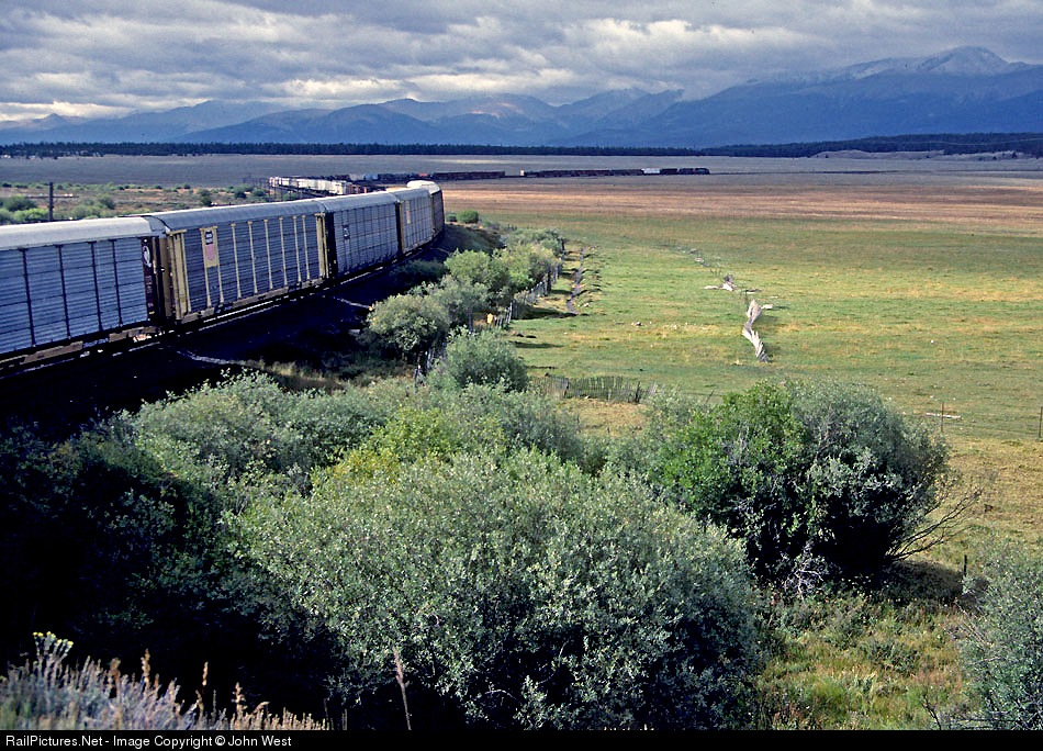 An eastbound manifest has topped Tennessee Pass and is starting the long descent via the Arkansas River valley. In the distance are some of the highest peaks in Colorado.