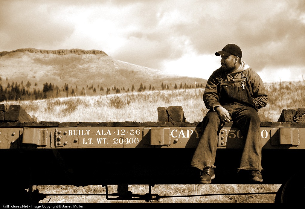 One of the crewmembers from the Chama Steam photo freight takes a well deserved break on an empty flatcar.