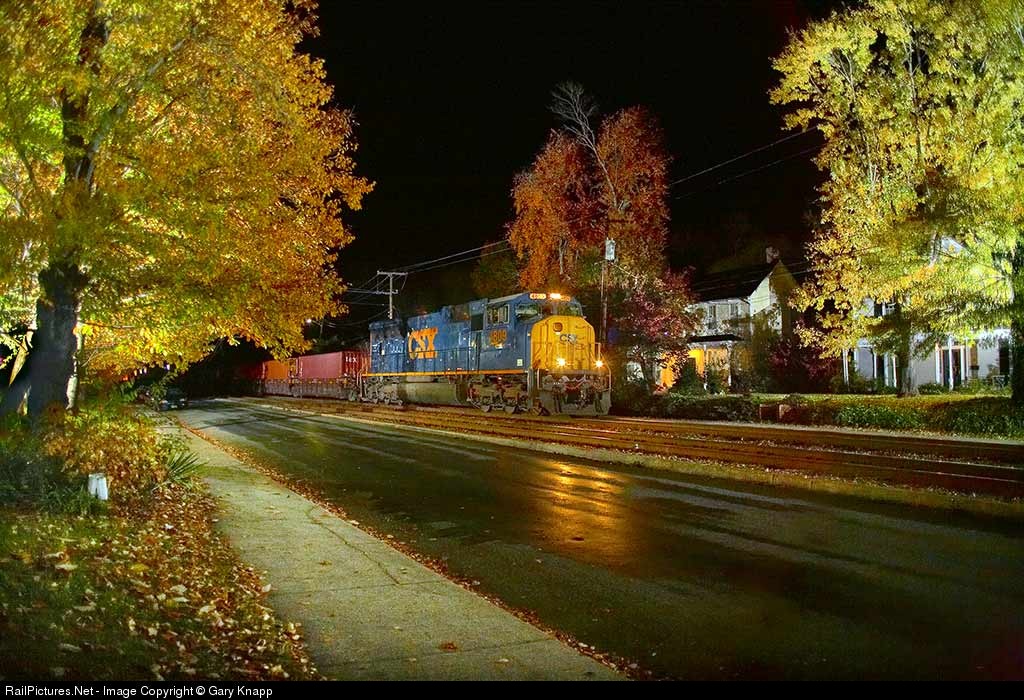 Southbound CSX intermodal behind a lone SD70MAC rolls 'em down the middle of Center Street amid the fall colors at 02:03. No auto traffic to get in the way of the view here at this hour!