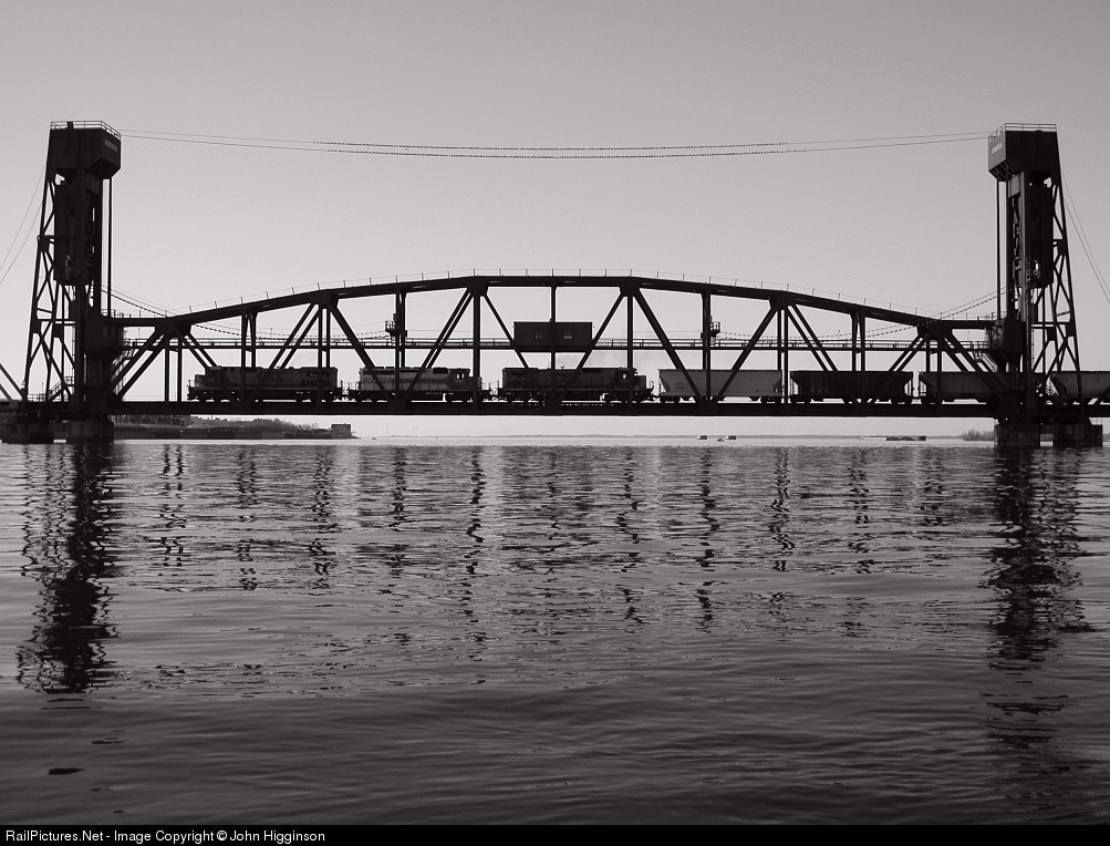 A southbound grain train is silhouetted against a clear sky as it crosses the lift span of the Tennessee River drawbridge. The single track bridge is owned by NS and NS dispatchers control the movement of both NS and CSX trains over it.