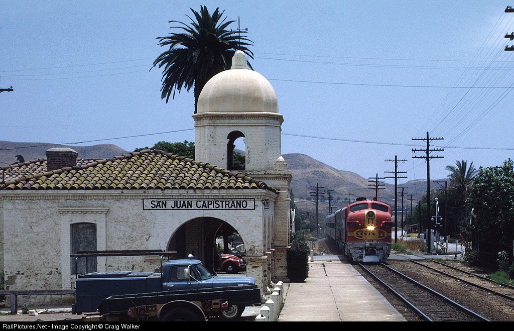 A Santa Fe San Diegan passes the distinctive mission-style station at San Juan Capistrano as it heads to Los Angeles from San Diego. The famed mission (where the swallows return each spring) is to the left, across the street.