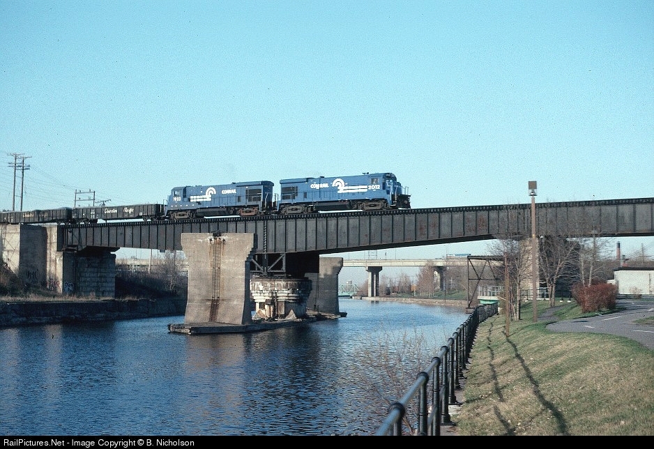 | The daily Conrail train from CP's Montreal Yard to Massena heads south across the Lachine canal. The train would branch off the CP line at Adirondack Jct and continie on ex-NYC rails via Huntington,Que. |