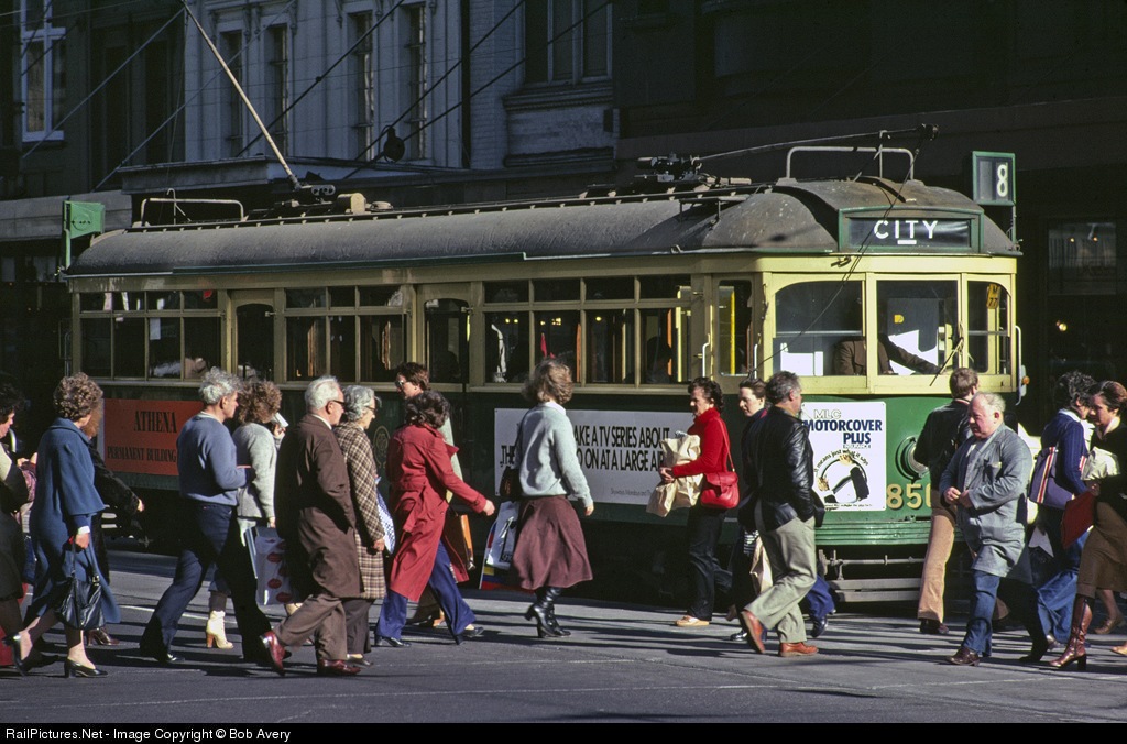 Homeward bound city workers cross the street in front of one of Melbourne's numerous charismatic tramcars. One Melbourne route still uses similar machines. Othere have found new lives in San Francisco and Seattle, amongst other places.