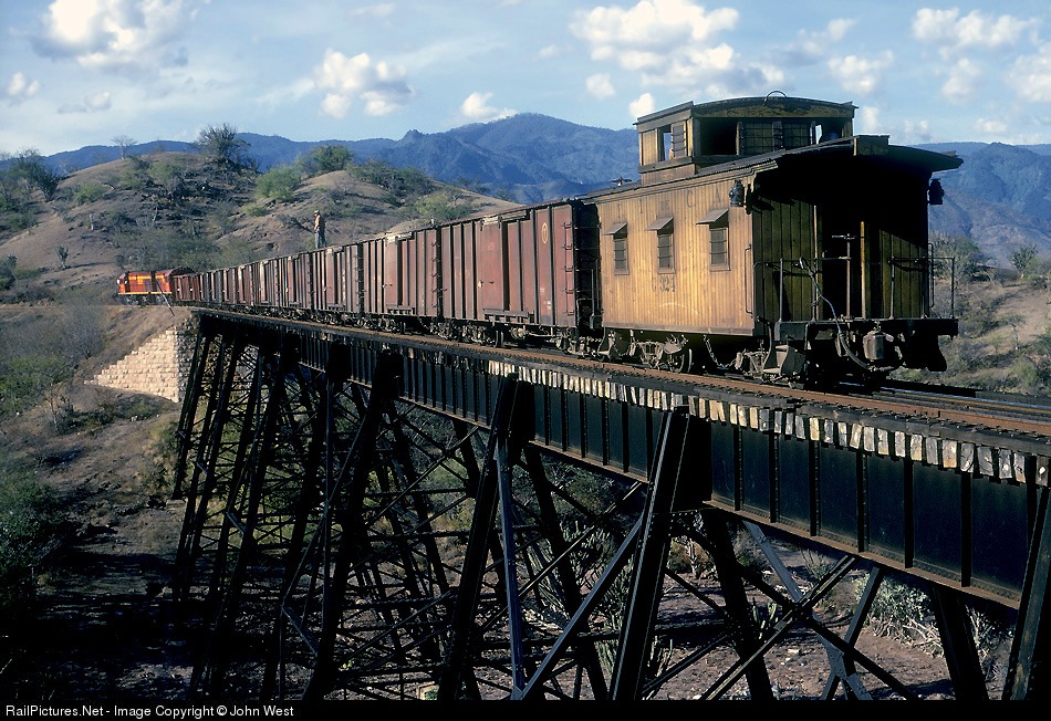 | Fegua freight heading uphill from Rancho to Guatemala City. The GE diesels have just been delivered. They are 900 h.p B-B units with Cat prime movers and built under license in Spain. Contrast new units with the caboose, markers and brakemen on top. |