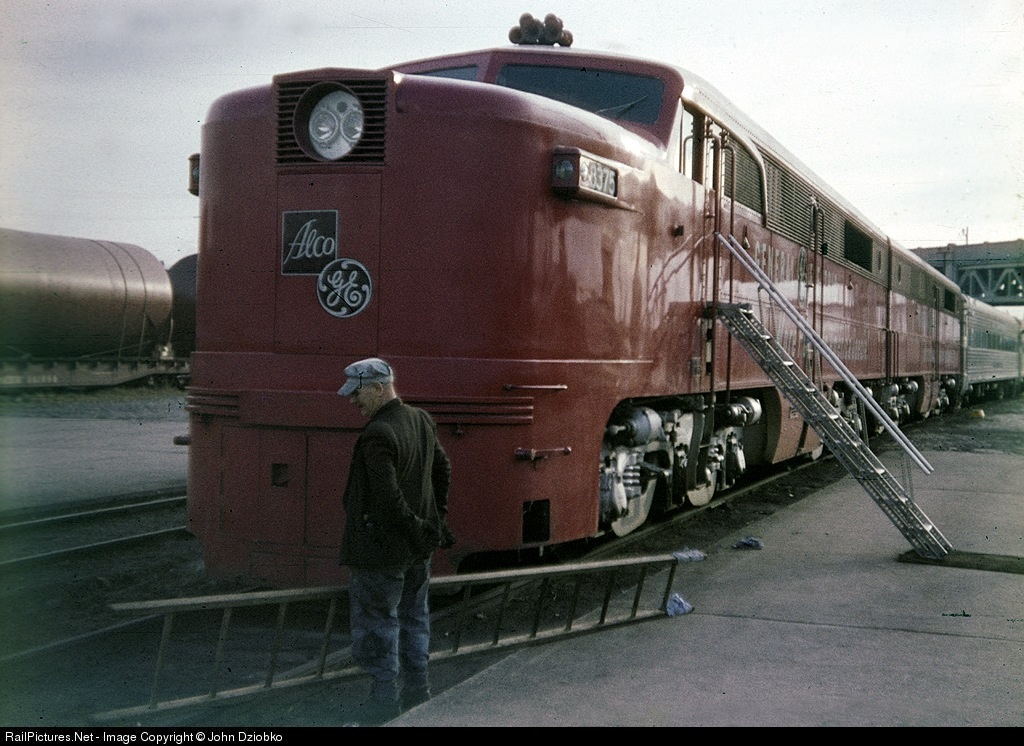 Built in March of 1950, the Alco-GE "More Power for America" locomotive is being set up for display at Newark. 6 years later had GE divorced Alco and started making their own line of products, soon capturing Alco's market share. Ansco color/color corrected in P/S