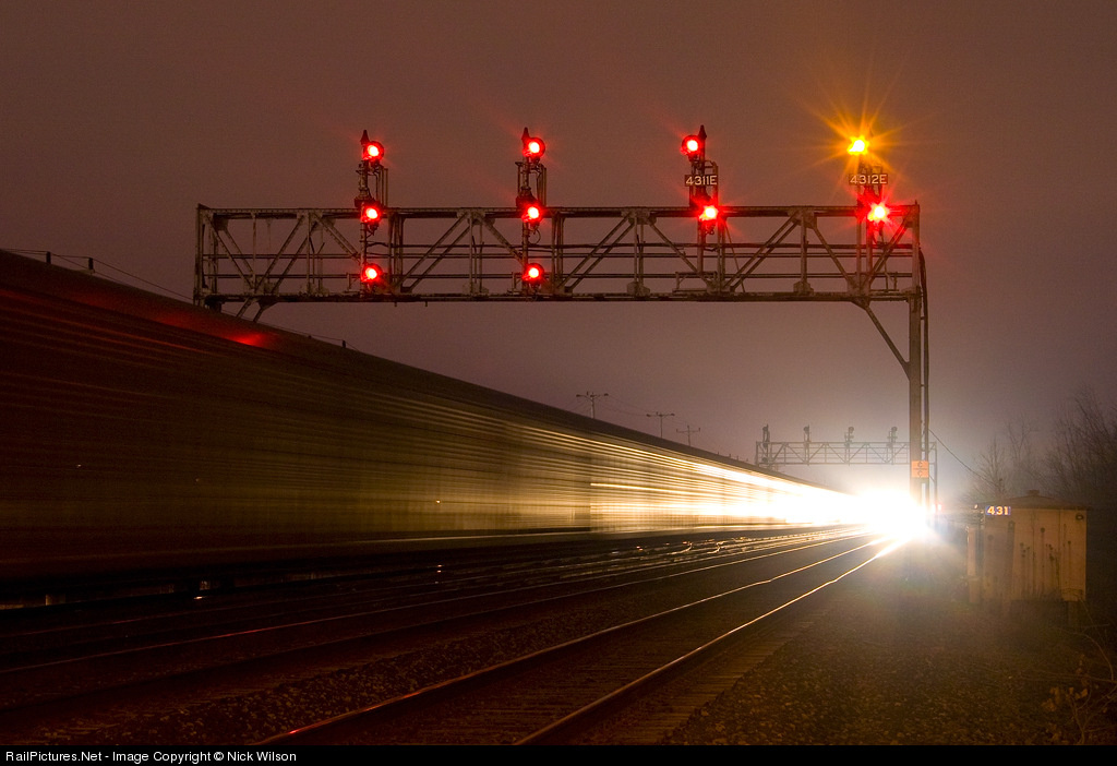 As an autorack train glides into Frontier Yard on track 4, Amtrak 281 slows for its station stop at Depew before continuing on to Exchange Street and Niagara Falls. The classic New York Central searchlight signals guard CP 431 here.