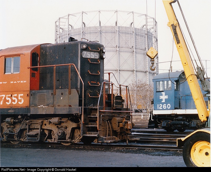 | The renumbering paint on this ex New Haven geep was hardly dry yet it was wearing thin and so was the future of the Penn Central. This image depicts many bygone symbols, B&M S2, New Haven GP9 and the great gas holder. What a country. |