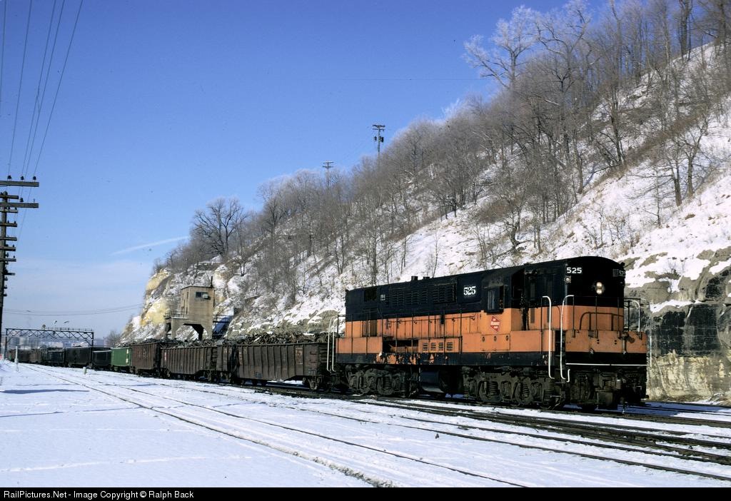 | Recently renumbered MILW 525 brings gondolas loaded with scrap metal, bound for the North Star Steel, past Burlington Northern's Hoffman Avenue Tower. MILW had six 1953-built F-M H16-66s originally numbered 2125-2130. All were renumbered twice - first in 1959 to 550-555 and finally 524-529 in December 1973. All were retired/scrapped in April-May 1976 after the arrival of 64 EMD MP15ACs.