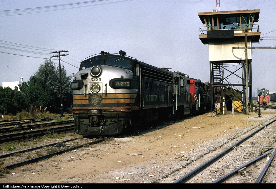 Ready to depart Newhall Yard, 6235 is still wearing Black Widow paint. The second two units are commute GP9's, the second unit being #5623, lateer preserved at Niles Canyon. With the exception of 5623, nothing in this photo still exists, even the white buildings to left have been replaced by new condos.
