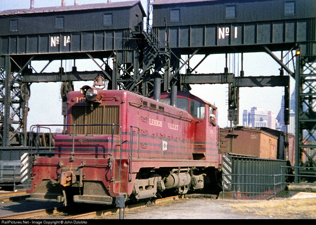 | The LV had 3 locations in the NYC harbor area where they conducted car float operations. #1 and #1A were in Jersey City. SW #108 was built in 1937-38. Here it shoves cars onto a LV barge with the Big Apple looming in the distance.