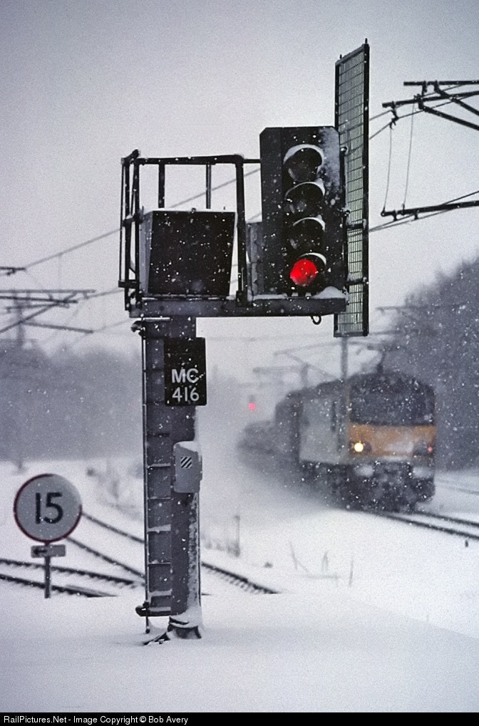 The overnight Sheerness-Mossend Yard 'Enterprise' freight working, passes Carstairs, about 15 miles short of its destination, during a heavy sbow shower.