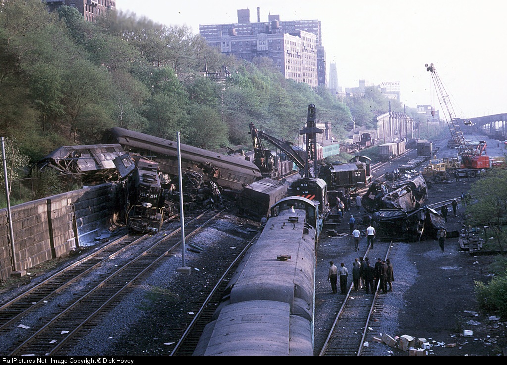Aftermath of catastrophic head-on collision. Southbound lead by RS-32 2020 and GP-35 2384 hit 4 FA's. Note FB tossed up on the embankment. 2020 remains are under the coach. The fuel fire delayed clean up for several days. Actual wreck date 5/22/67