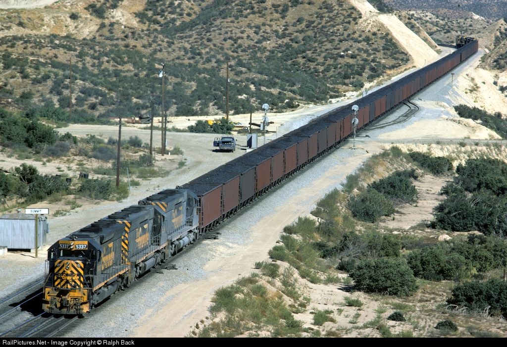 | Three D&RGW SD45's power a loaded Kaiser coal train passing the station sign at Summit and destined for the (closed in the early 1980's) Kaiser Steel Mill at Fontana, CA. The Union Pacific worked the joint D&RGW-UP-AT&SF train from Utah to Barstow, CA where the complete train with motive power was turned over to the Santa Fe which added helpers on the rear and took it over Cajon Pass to Fontana. The entire train with Santa Fe helpers and UP caboose can be seen in this view. |