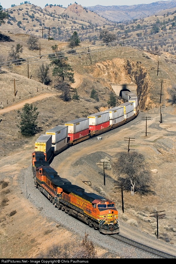 BNSF 4878 leads a stack train upgrade southbound out of Tunnel 10 after negotiating the Tehachapi Loop moments before.