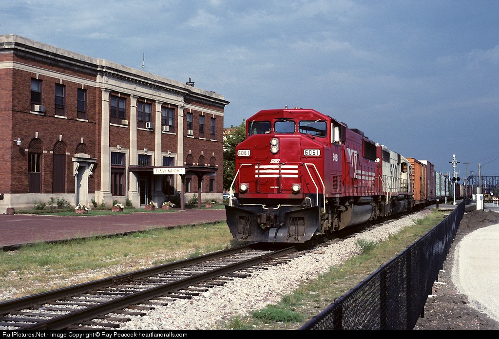| It was a big deal to see the SOO widecabs come through town, they only had 5 out of a total of 63 SD60s. Here 6061 passes the old DRI-Line Union Station, built to CB&Q specs. |