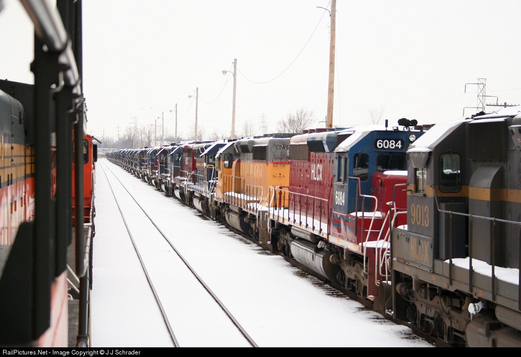 The view of over 40 SD40's and SD45's being stored in CSXT's MC Grew yard in Flint. The vantage point is from BNSF 5967 as it delivers a grain train. Also in the storage line was an ex. SP SD40T-2 along with many Morrison Knudsen and HLCX engines. For more see http://www.railpictures.net/viewphoto.php?id=173348