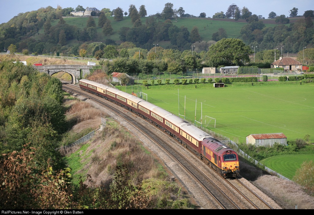 | English Welsh & Scottish (EWS) Class 67 locomotive approaches Bath with a Northern Belle luxury excursion from Manchester to the Georgian City. The photo was taken from above the mouth to Twerton Tunnel on the western edge of Bath. |