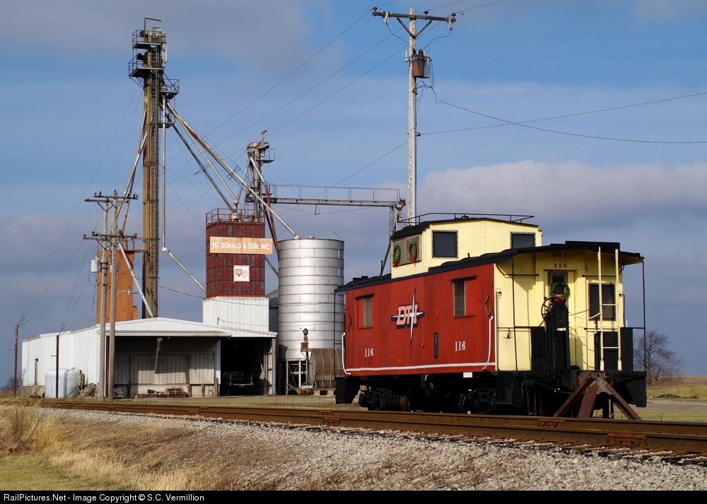 The best looking DT&I caboose still around today is owned by the Mc Donald & Son feed company, who's elevators rise tall in the background.