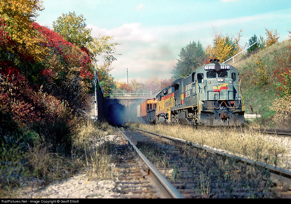 | Fall colors and an equally colorful lashup are seen as CSX's "Pelton Turn" emerges from the westbound 'tube' of the CASO's Detroit River tunnel as it makes it's daily trip from CSX's Rougemere yard in Dearborn to Canada and back. |