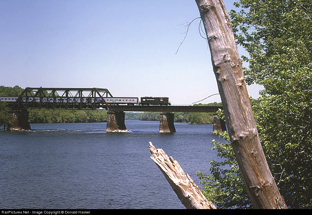 | Artistic shot of PC varnish crossing the Conn River. Penn Central has taken over the New Haven Railroad and is now burdened with Passenger train expenses. Soon Amtrak will be formed and the situation will not get much better. |