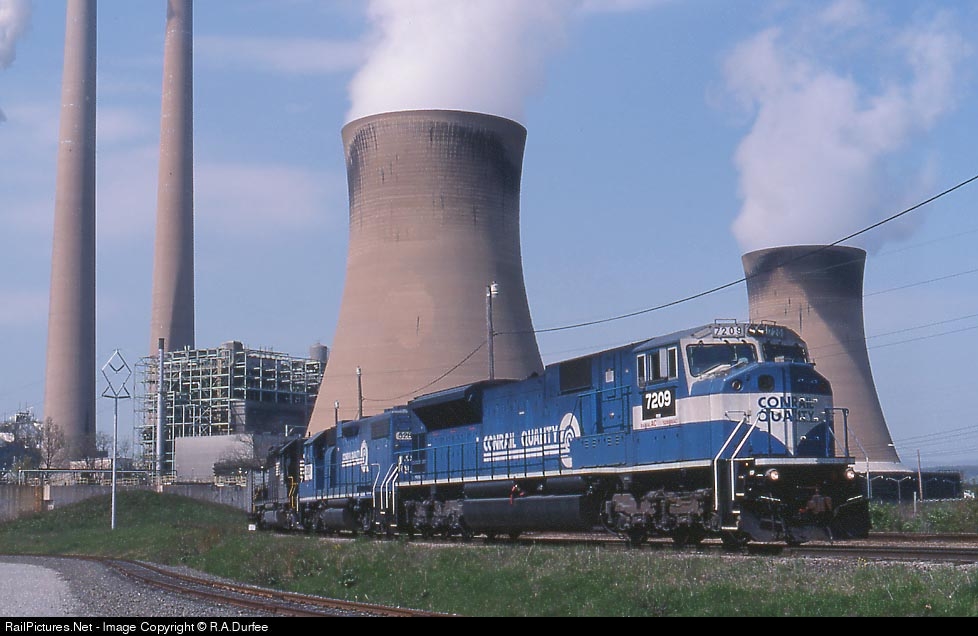 The cooling towers of the Huff power plant loom over this train as it spots the coal loads.