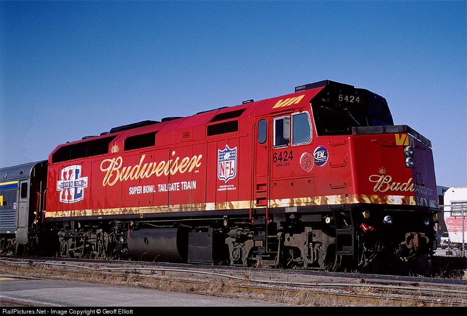 | This BUD's for you!! VIA #6424, the "Budweiser Tailgate Train" sits at the station in Walkerville, Ontario. Budweiser was promoting Superbowl XL in Detroit, Michigan with winners of their contest being brought via a special train from Toronto to Windsor for Superbowl Parties. 2 Grandprize winners won tickets to attend the game in Detroit. |