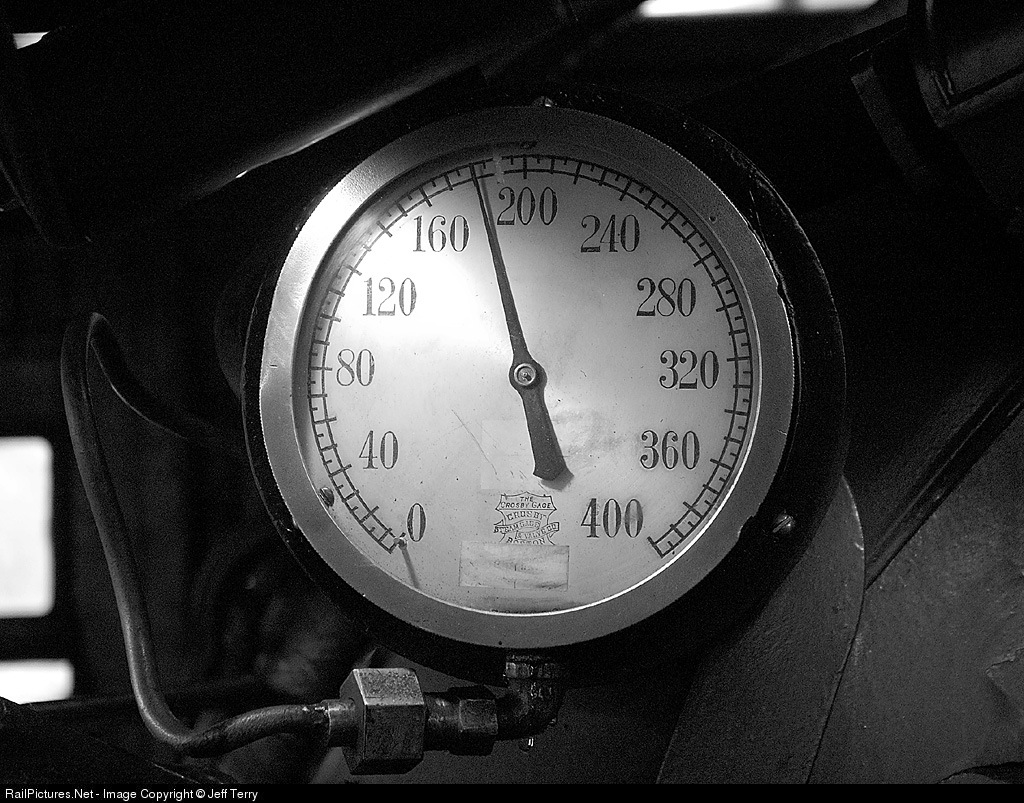 Steam pressure gauge on the fireman's side of Nevada Northern 2-8-0 No. 93.