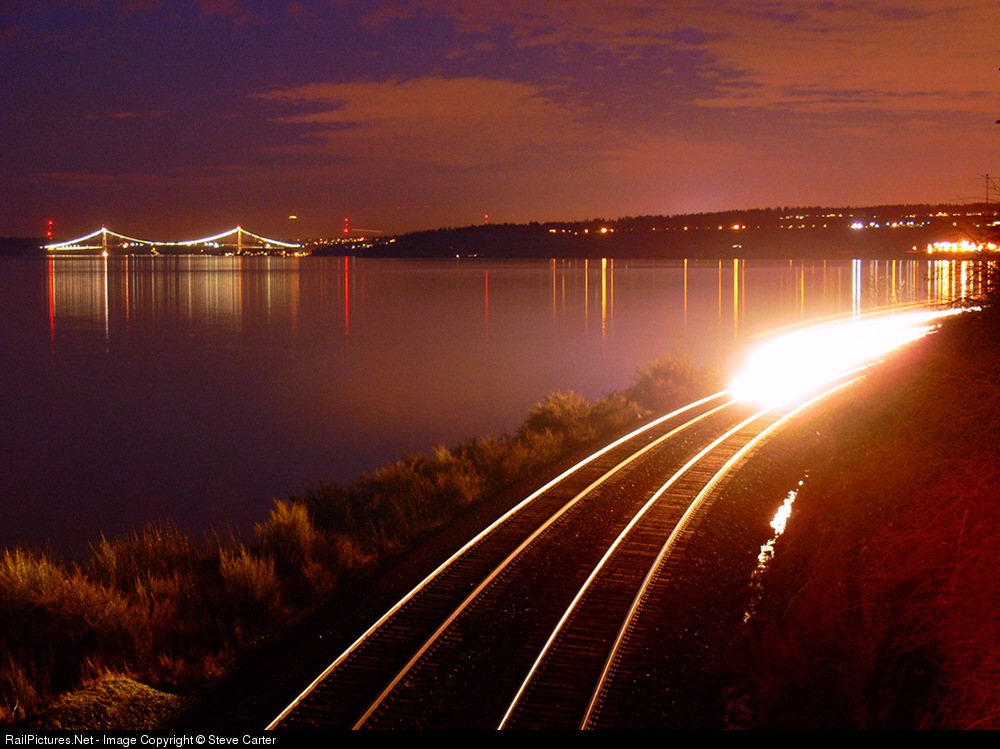One of about 10 trains through in a hour, after a work window closed. Just south of Steilacoom with the Tacoma Narrows Bridges in the background.