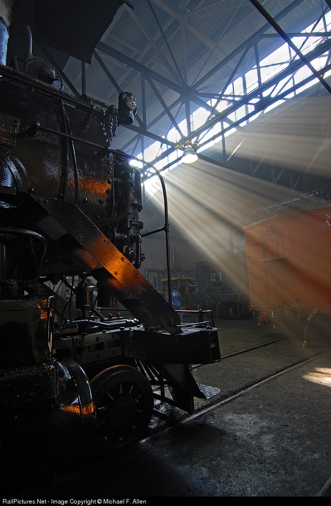 Afternoon sun beams highlight the smoke from no. 93, steaming quietly in the Nevada Northern shops.