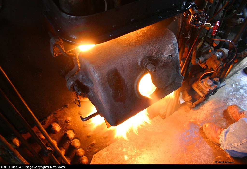 | Fire shoots out of the Crossett Western (1929 Alco 2-8-2T) #10's firebox while working hard uphill. The steam crew has since added a "fire guard" onto the firebox making shots like this a thing of the past. |