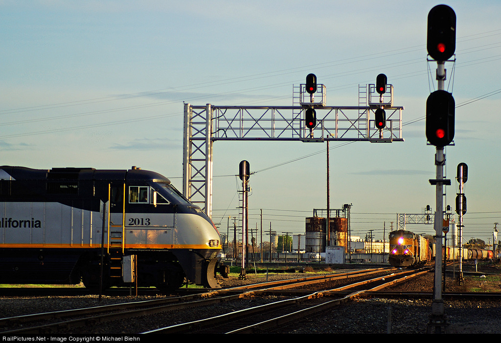 A UP freight waits as a southbound Amtrak California glides by at Stockon Tower.