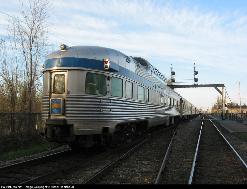 VIA's Sleeper Buffet-Lounge Dome Observation car number 8704, the Evangeline Park, is on the tail end of the Ocean at St-Lambert, QC on May 8th, 2002.