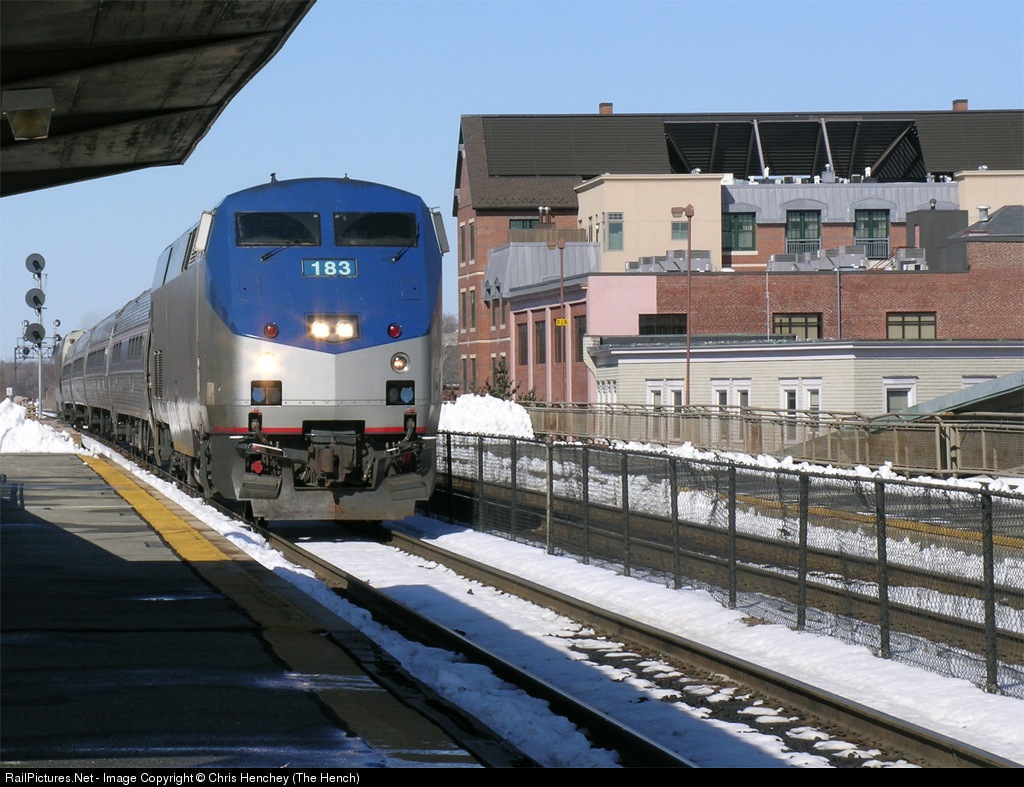 Amtrak 684 highballs through Winchester Center, on its way to Boston. The line through downtown Winchester is elevated, hence the tops of the building being shown.