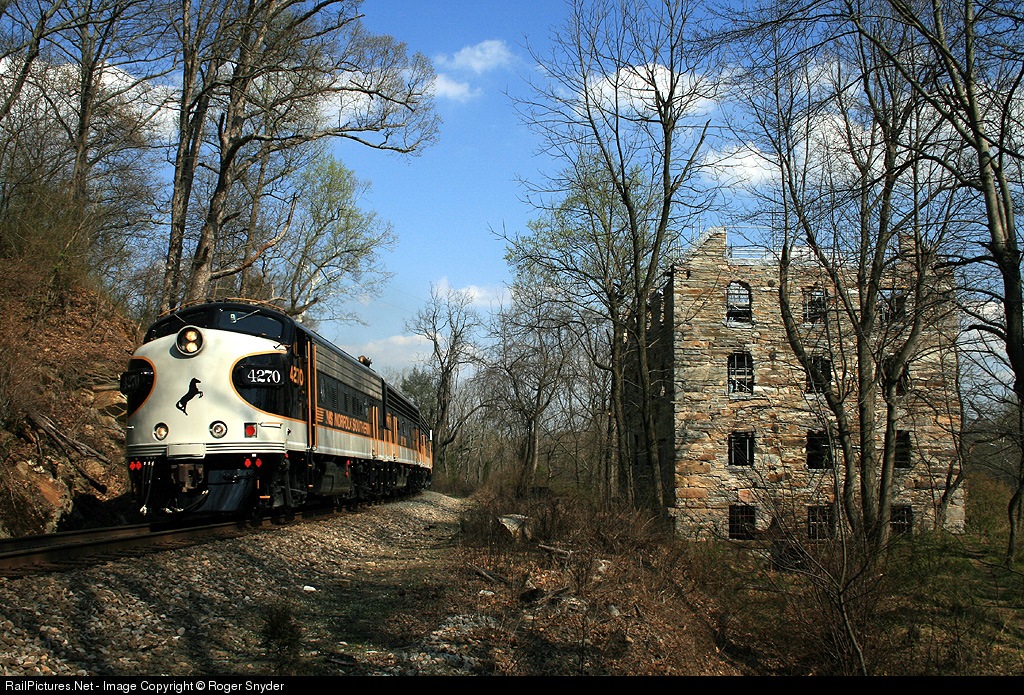 "AFTERNOON DELIGHT" NS955, chased but never subdued, slips past the ruins of Chapman's Mill in Thoroughfare Gap, VA, about mp 14 on the NS B-Line at 3:20pm on 4/10/07 The mill was built in 1742 and the Manassas Gap Railroad was finished in 1852. Later a Southern RY branchline, it is fitting that 955 is led by a venerable F unit with a Southern look to the livery. Gosh, what a wonderful sound that lead unit made passing through the gap.
