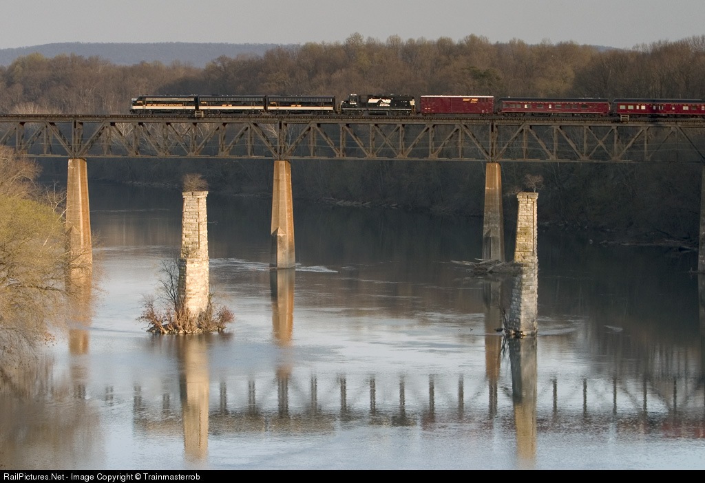After a joyous week in the Peach state, the NS F-units catch the last sun rays of the day as she rolls across the trestle at Shepherdstown, WV, enroute to Altoona, PA.