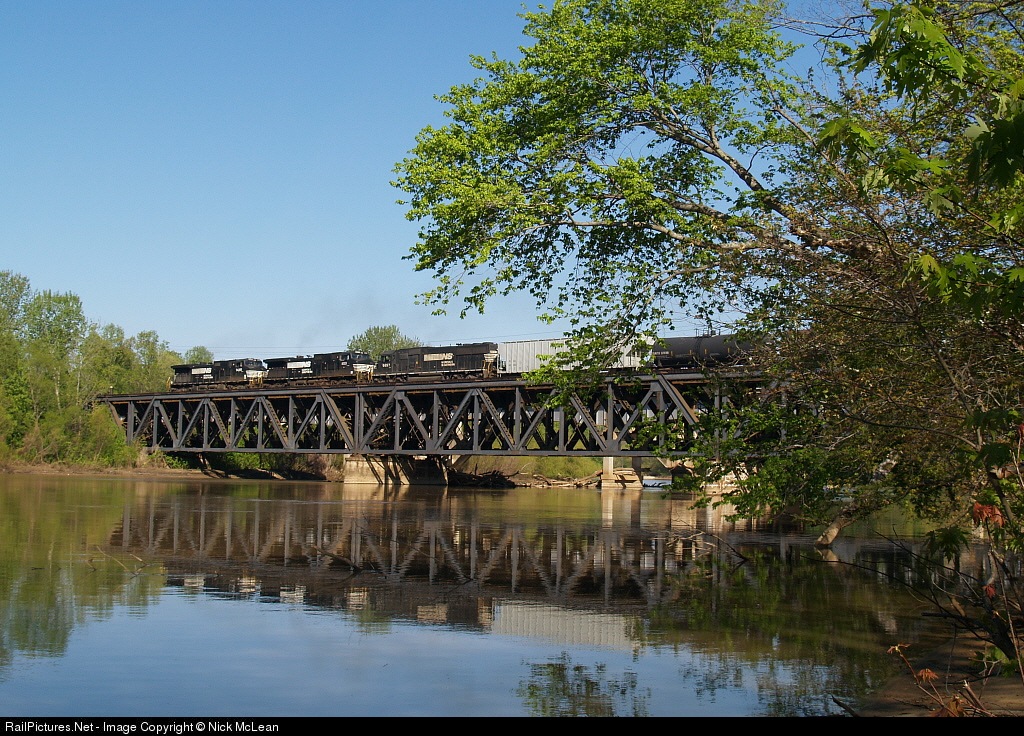 | 9085 runs long hood forward across the Yadkin River after leaving Linwood Yard with 48 cars. The intended lead engine was sidelined with mechanical issues before departure. 9085 will turn on the wye in Salsbury and continue onto the S-Line facing the right direction. |