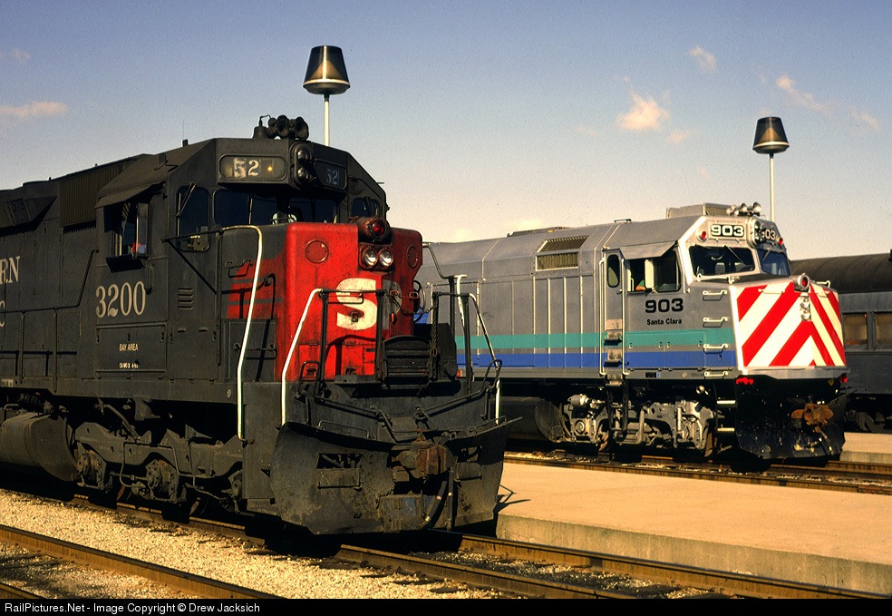 | Spring of 1985 was a time of transition on for Peninsula Commute Service. The new F40's were arriving and being put in service but pulling the old SP coaches and were working alongside some of the SP power still in use. SDP45 #3200 is ready to leave the City with CalTrain #903 waiting in the background. |
