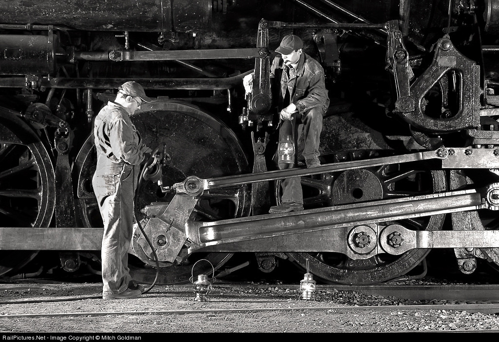 A variation of a theme inspired by O'Winston Link, Pere Marquette #1225 gets her rods lubricated at the Steam Railroading Institute shops prior to a weekend of excursions through Southern Michigan. Lighting by Pete Lerro. Click Here and compare to a similar scene with UP #844. bw