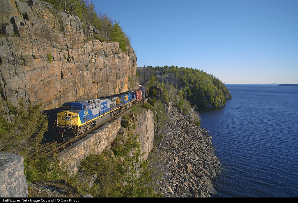 CSX power, "off-line" on CP Rails' D&H, lead CP 930 high above Lake Champlains' Willsboro Bay through one of the many scenic locations on the D&H at 07:33.
