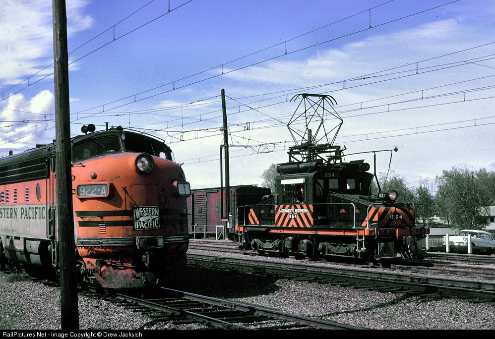 | WP freight slows as it passes Sacramento Northern 654 in the Marysville yards. The trackage around Marysville and Yuba City was the last vestige of SN's extensive network still under wire, |