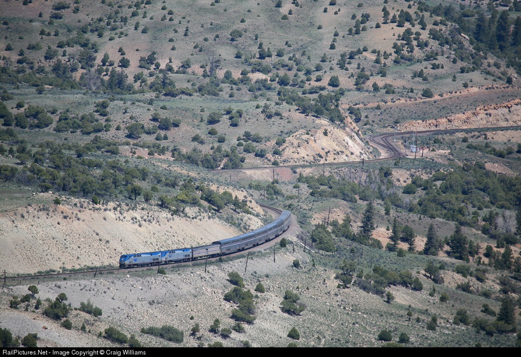 | The westbound California Zephyr is snaking along the Colorado River Valley just west of the switch at Azure which is seen in the background. The train will be to Bond, CO in about 15 miles. |