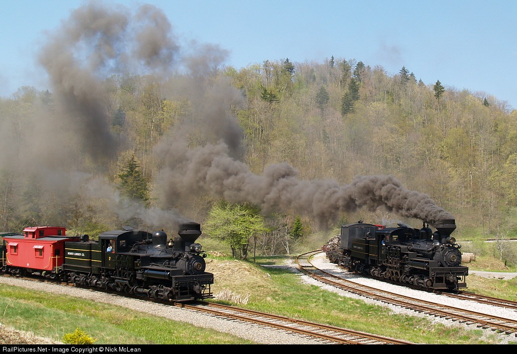 Cass’s two popular west coast Shays (2 from British Columbia and 11 from California) arrive at the junction of the CSRR and the West Virginia Central at Spruce.
