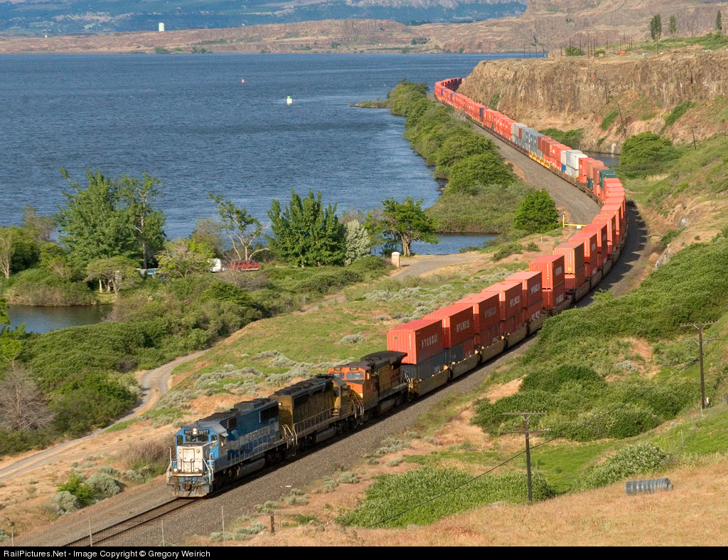 An EMD SD60 leads a Tacoma to Chicago Hyundai stack train along the shores of the Columbia River.