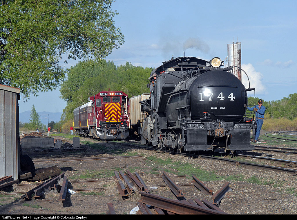 Steam has returned to Alamosa! Former Southern Pacific RR 1744 had been wyed after working 4-car San Luis Express train from La Veta, CO. SLRG B39-8 8577 had wyed two-car Antonito train. It was ready for May 27th 8:15 AM Alamosa departure.