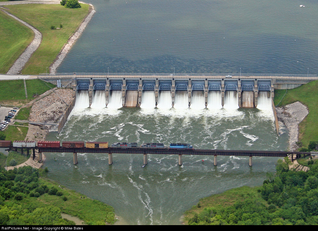 This train was moving across the bridge at about 25 MPH. The flood gates on Lake Lavon are rarely open. Catching a train on the bridge with the dam and the floodgates open 'took a little work".