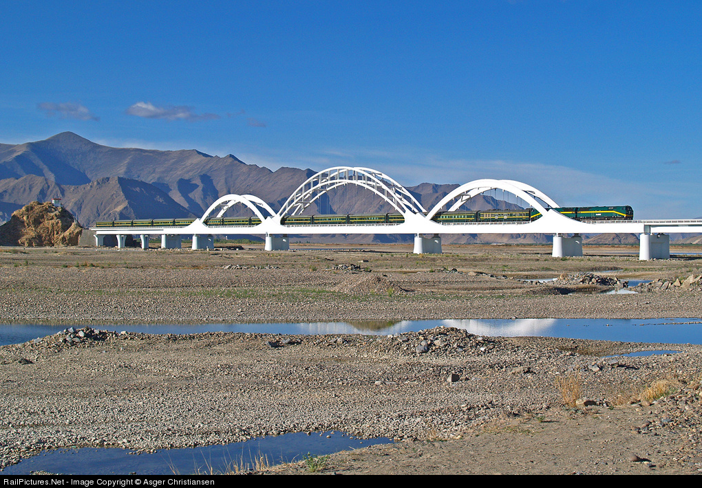 | The daily Beijing-train has just left Tibet capitol Lhasa on its 4.064 km (2.540 miles) and 47 hour journey. The highest point on the new Qinghai-Tibet railway is at 5.072 m (16.640 feet) - a new world record. The locomotives of type C38AChe are built by General Electric, Pennsylvania, USA |