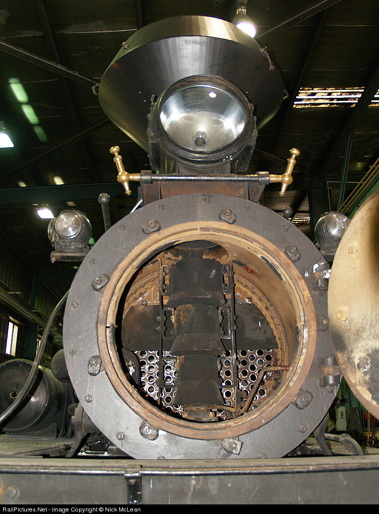 | An interesting study of the nozzle structure and front flue sheet inside the open smoke box of 102 year old Shay 5 residing in the Cass Shop. Even without the spark arrestor, that stack is rather imposing at the better part of 6 feet tall. |